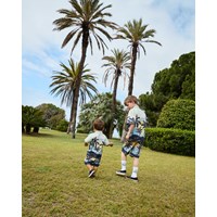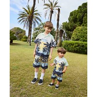 Kurzärmeliges, Oversized weißes Hemd aus Öko-Baumwolle mit Kragen und Knöpfen auf der Vorderseite. Das Hemd ist mit einem Druck bunter Sommerblumen, Vögel und Schmetterlinge versehen. Kombinieren Sie es mit passenden Shorts für ein komplettes Set.