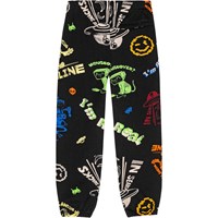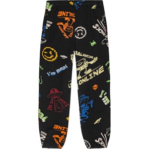 Schwarze Öko-Baumwoll-Jogginghose mit elastischem Bund, innenliegendem Kordelzug, Seitentaschen und elastischen Bündchen an den Knöcheln. Die Hose hat eine reguläre Passform und ein mehrfarbiges All-Over-Muster. Das Muster zeigt verschiedene bunte Comicfiguren, wie zum Beispiel einen Alien, der nach Snacks sucht und Bananen in sein UFO hochbeamt, eine Katze mit einem Bildschirm als Kopf, die eine Computermaus betrachtet, und einen Alien, der eine VR-Brille trägt. Ein lebhaftes Muster mit vielen lustigen Details.
