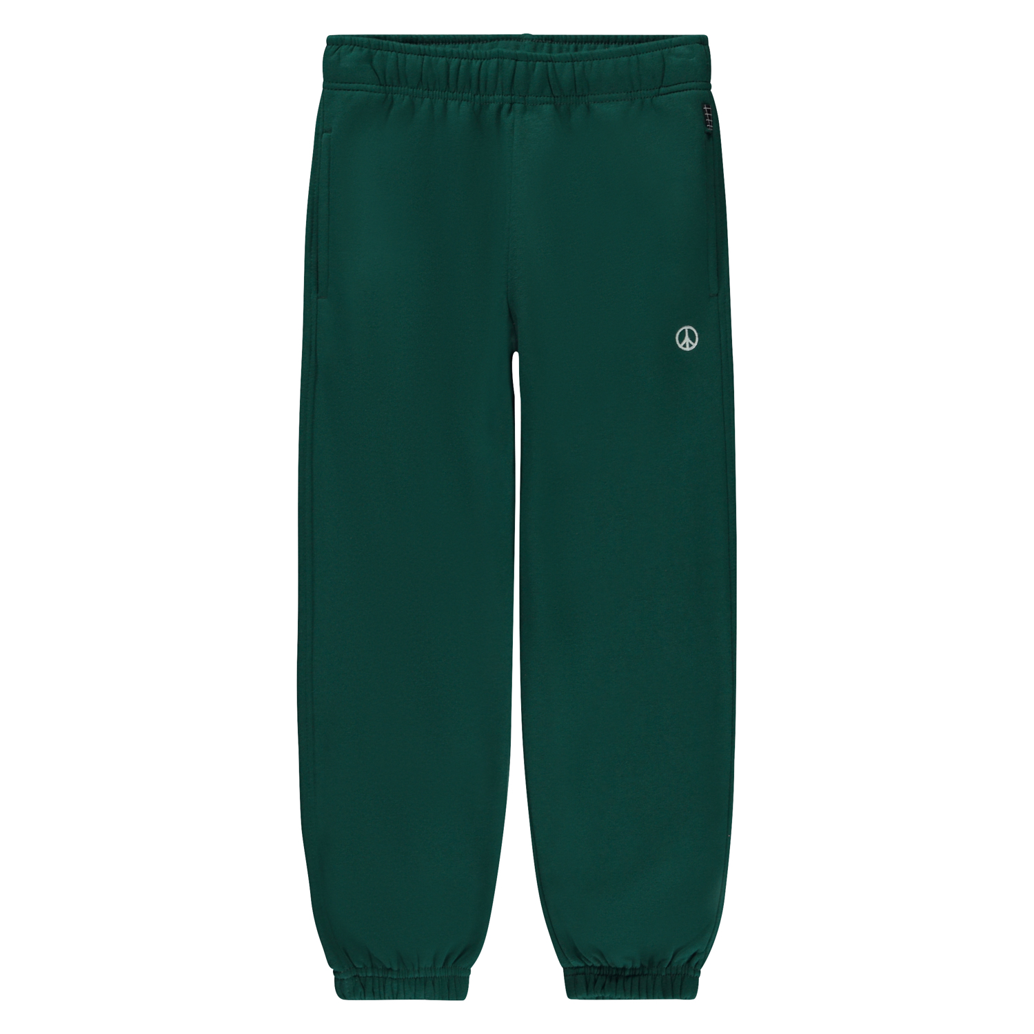 Dunkelgrüne Jogginghose mit weißem Peace Sign Print. Diese Hose besteht aus 100% Baumwolle, hat ein Gummiband und ein Innenfutter in der Taille, ein Gummiband an den Knöcheln, Seitentaschen und eine Hintertasche. Die Hose hat eine normale Passform. Kombieren sie möglicherweise die Hose dem Hoodie, Mazz, in der gleichen Farbe France das perfekte Sett.