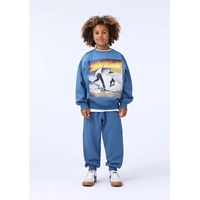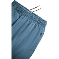Blaue Jogginghose aus Öko-Baumwolle mit einem verstellbaren elastischen Bund, Seitentaschen, einer einzelnen Gesäßtasche und elastischen Bündchen an den Knöcheln. Die Jogginghose hat eine normale Passform.