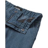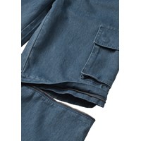 Cargo-Hosen mit abnehmbaren Beinen aus blauem Baumwoll-Denim in lockerer Passform. Die Hosen haben Seitentaschen, Gesäßtaschen und Cargotaschen sowie einen verstellbaren elastischen Bund. Der untere Teil kann abgezippt werden, wodurch die Hosen zu Shorts werden. Die kleinsten Größen (92–134) haben einen Druckknopf, während die Größen 140–176 einen klassischen Jeansknopf haben.