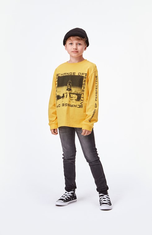 Aksel sind ein Paar slim fit Jeans in verwaschenem Schwarz. Beachten Sie, dass die Größen bis 134 einen Druckknopf und nicht einen gewöhnlichen Jeansknopf haben.