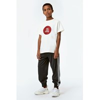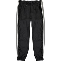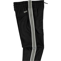 Albie ist eine dunkelgraue Trainingshose mit einem weißen Netzstreifen an der Seite der Beine. Die Hose hat Reißverschlusstaschen sowie eine elastische Taille mit Bindeband und elastischem Beinende.