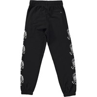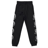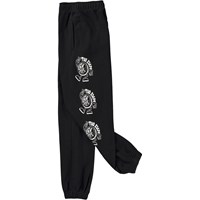 Schwarze Jogginghose mit weißem Aufdruck an den Seiten. Der Aufdruck ist eine handgezeichnete Comicfigur, die die Botschaft „Peace Out“ verbreitet. Die Hose hat eine normale Passform, einen verstellbaren elastischen Bund, Seitentaschen, eine Gesäßtasche und einen Gummizug an den Knöcheln.