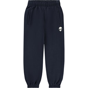 Dunkelblaue Jogginghose aus Öko-Baumwolle mit einem verstellbaren elastischen Bund, Seitentaschen, einer einfachen Gesäßtasche und elastischen Bündchen an den Knöcheln. Die Jogginghose hat eine normale Passform und einen weißen Aufdruck eines kleinen Außerirdischen neben der Tasche.