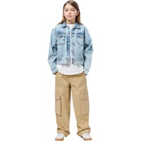Beige Hosen aus weicher Baumwolle mit weiten Beinen und großen Cargotaschen an der Seite. Die Hosen haben Vorder- und Gesäßtaschen, Gürtelschlaufen und einen verstellbaren elastischen Bund für eine optimale Passform. Die kleinsten Größen (92-134) haben einen praktischen Druckknopf, während die Größen 140-176 mit einem klassischen Jeansknopf ausgestattet sind.