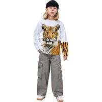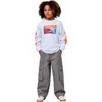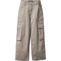 Graue Hosen aus weicher Baumwolle mit weiten Beinen und großen Cargotaschen an den Seiten. Die Jeans haben Vorder- und Gesäßtaschen, Gürtelschlaufen und einen verstellbaren elastischen Bund für eine optimale Passform. Die kleinsten Größen (92-134) haben einen praktischen Druckknopf, während die Größen 140-176 mit einem klassischen Jeansknopf ausgestattet sind.