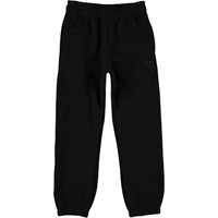 Am ist eine schwarze Jogginghose mit schwarzen Streifen an den Beinen. Am hat eine elastische Taille.