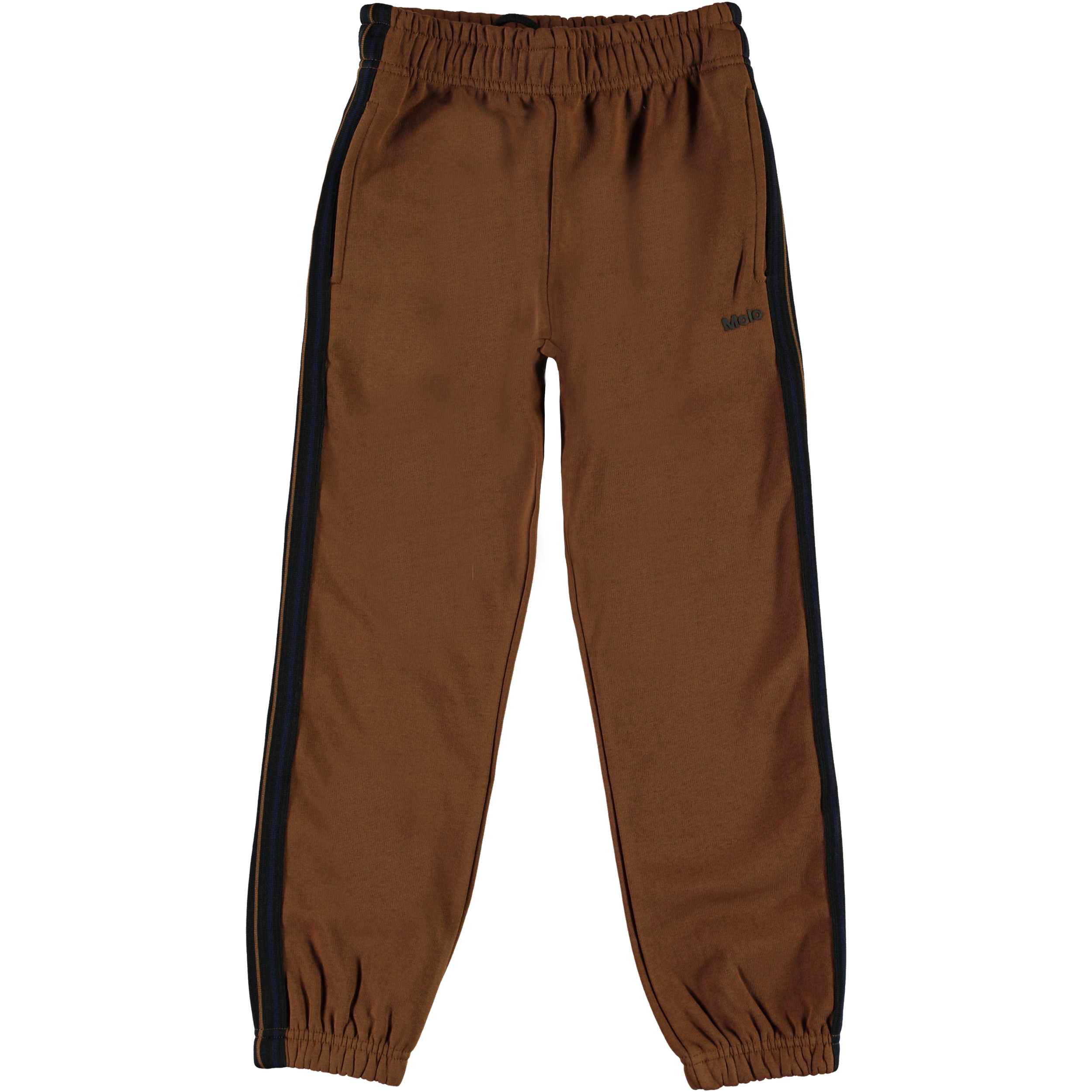 Am ist eine braune Jogginghose mit schwarzen Streifen an den Beinen. Am hat eine elastische Taille.