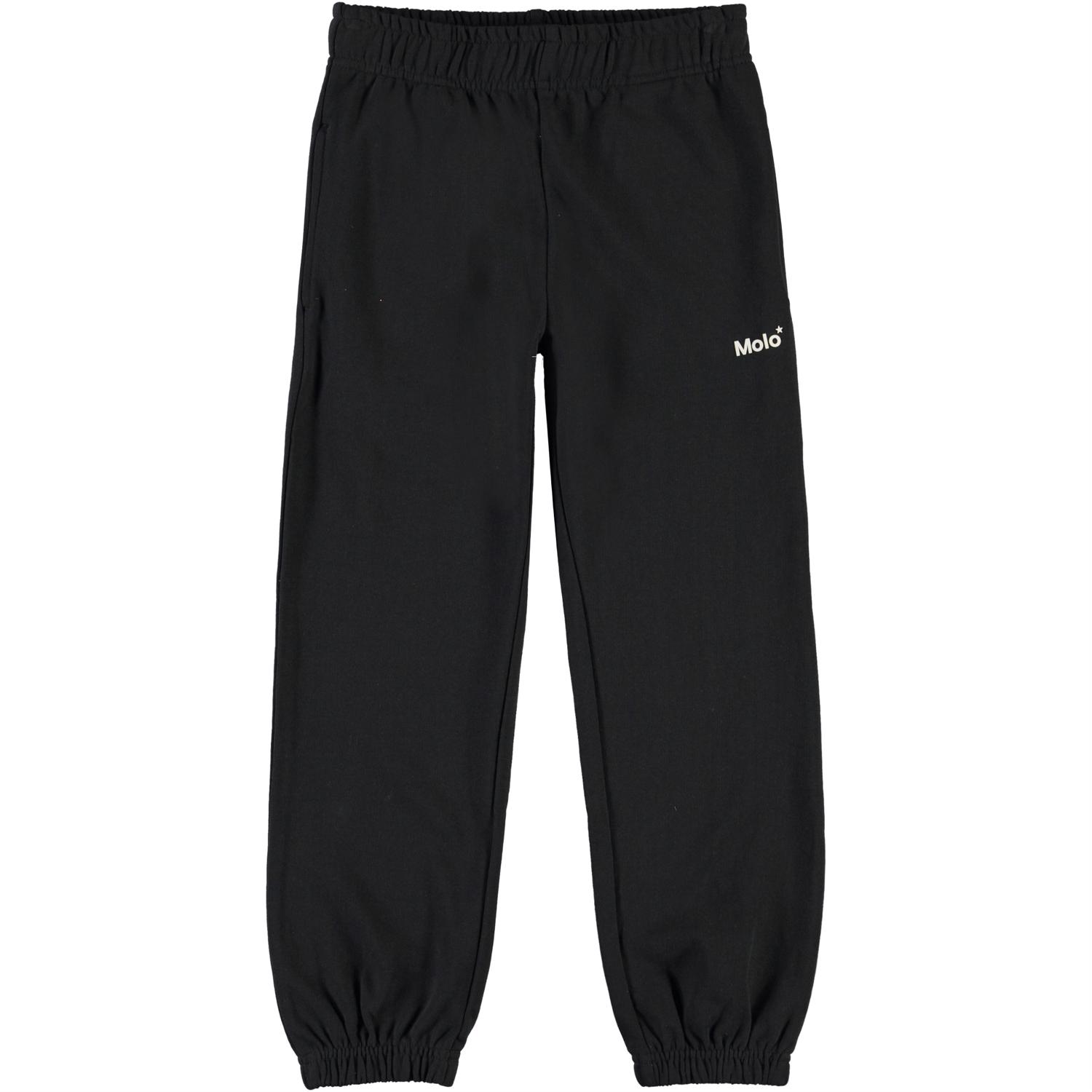 Am sind ein Paar schwarze Sweatpants mit Molo-Logo auf der Vorderseite und 'One world' Druck auf der Hintertasche. Die Hosen haben elastische Taille und Beinende. Ecocert Greenlife, certifikationsnr. 197496.