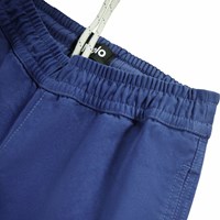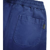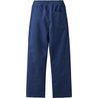 Blaue Chinohose aus Öko-Baumwolle mit elastischem Bund und innenliegendem Kordelzug. Die Hose hat seitliche Taschen und eine lockere Passform.