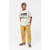 Ockerfarbene Hose aus Öko-Baumwolle mit einem elastischen Bund und einem inneren Zugband. Die Hose ist mit Seitentaschen ausgestattet und hat eine lockere Passform.