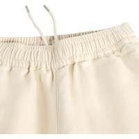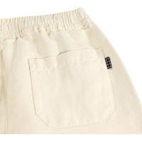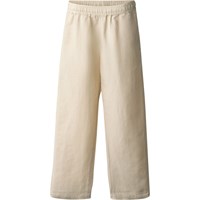 Helle beige Hose aus einem weichen Leinen-Baumwoll-Mix mit geraden Beinen und einer lockeren Passform. Die Hose hat einen elastischen Bund, eine einzelne Gesäßtasche und ein schlichtes Aussehen, das sie perfekt für warme Tage und legere Outfits macht.