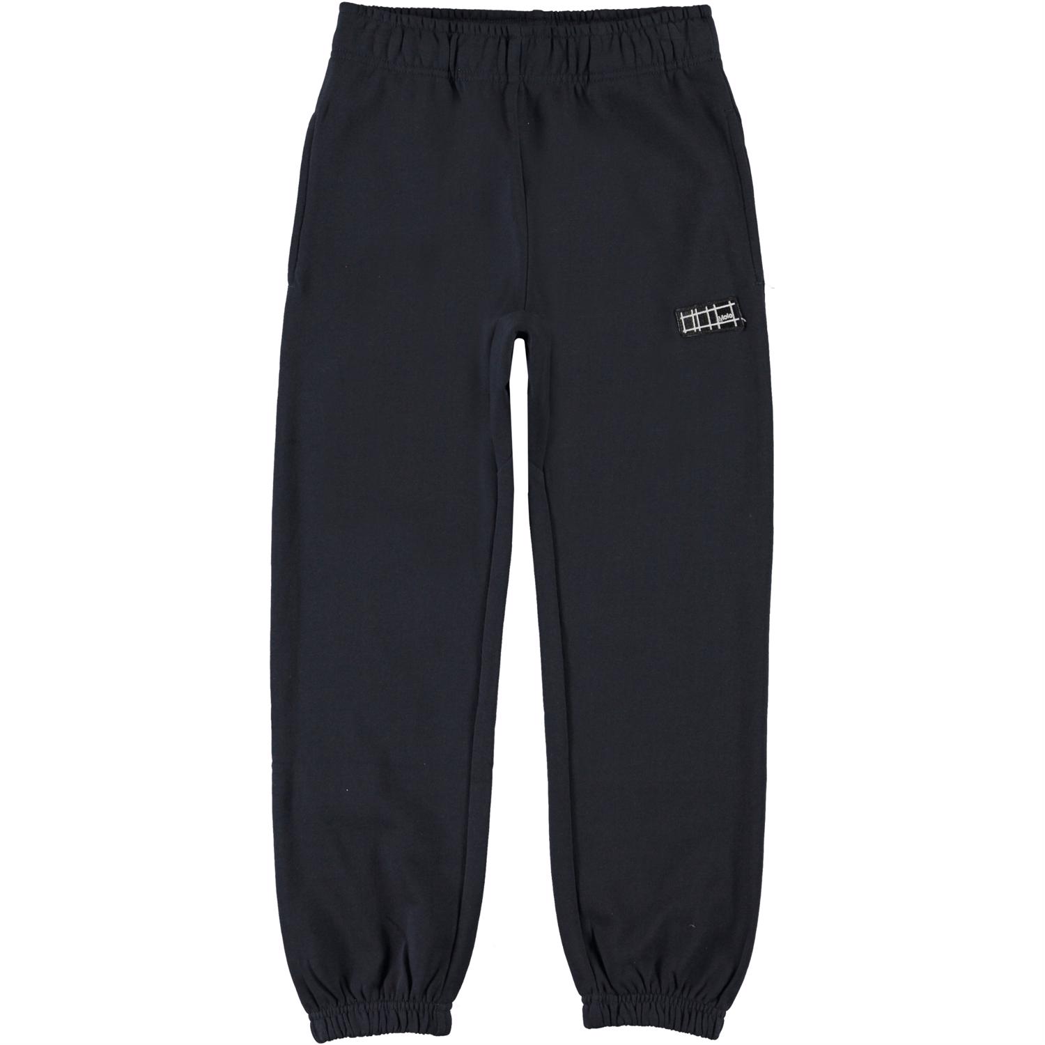 Ams ist eine dunkelblaue Jogginghose mit dem Molo-Logo auf der Vorderseite. Die Hose hat elastische Taille und Beinende.