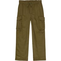 Armee-grüne Cargohosen aus Öko-Baumwolle mit elastischem Bund, innenliegendem Kordelzug und regulärer Passform. Die Hosen haben Gesäßtaschen, Seitentaschen und eine Tasche an jedem Oberschenkel.