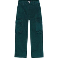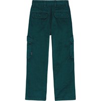 Grüne Baumwoll-Cargohose mit Seitentaschen, zwei Gesäßtaschen mit versteckten Druckknöpfen und einer Tasche an jedem Oberschenkel. Die Hose hat eine lockere Passform und der Bund kann mit einem internen Gummizug angepasst werden, um eine perfekte Passform für alle Kinder zu gewährleisten. Größen 92-134 haben Druckknöpfe, die das An- und Ausziehen erleichtern, während Größen 140-176 einen regulären Jeansknopf haben.