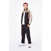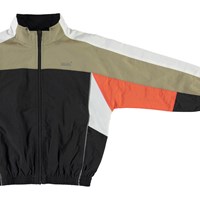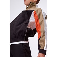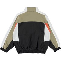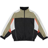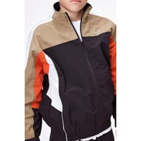 Molton ist eine beige und schwarzer Trackjacke mit weißen und orangefarbenen Detaills an den Seiten.