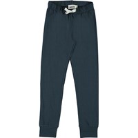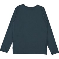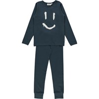 Zweiteiliges Schlafanzugset in Blau mit Druck von einem Smiley auf dem Oberteil. Die Hose hat Bandeband an der Taille und das Oberteil hat lange Ärmel. Ecocert Greenlife, certifikationsnr. 197496.