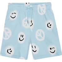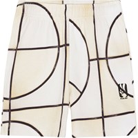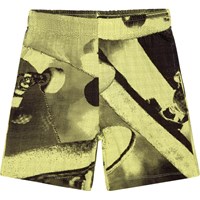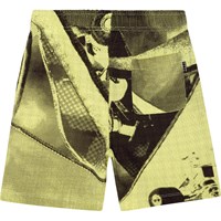 Shorts aus Öko-Baumwolle mit einem gelb-schwarzen Allover-skateboard-Print. Der Druck ist ein zweifarbiger abstrakter Druck, der ein nahezu lebensgroßes Skateboard zeigt. Die Shorts sind knielang, haben eine normale Passform mit verstellbarem elastischem Bund, seitlichen Nahttaschen und einer einzelnen Gesäßtasche.