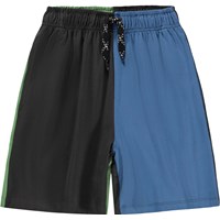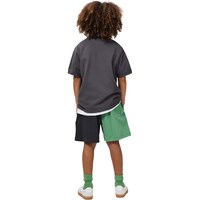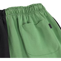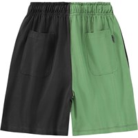 Schwarze, blaue und grüne Shorts aus Öko-Baumwolle. Die Shorts haben eine lockere Passform, mit Seitentaschen, Gesäßtaschen sowie einem elastischen Bund und Kordelzug, was sie bequem und bewegungsfreundlich macht.