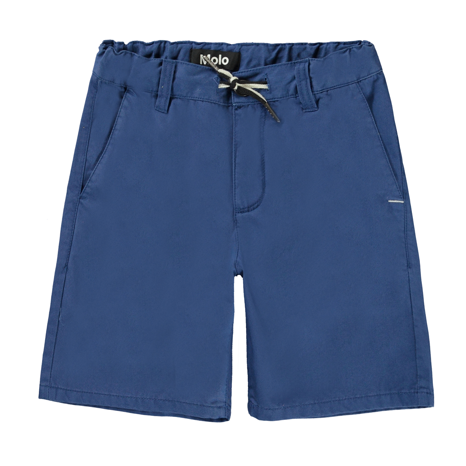 Ajvin ist eine dunkelblaue Shorts mit seitlichen Taschen, Bindebändern in der Taille und einer Hintertasche sowie einem schwarz-weißen Logo-Patch.