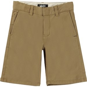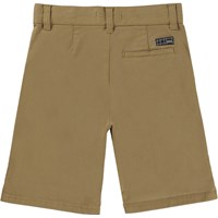 Alan ist eine beige Chino-Shorts mit zwei Vordertaschen und einer Hintertasche. Über der Hintertasche befindet sich ein Logo-Patch in Schwarz-Weiß.