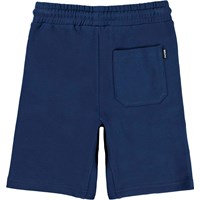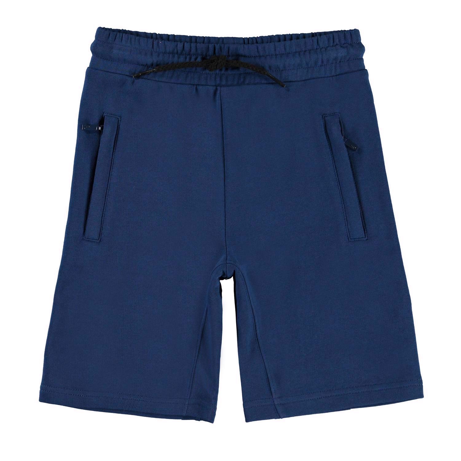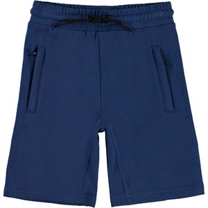 Aliases sind marineblaue Shorts aus Öko-Baumwolle. Vorne befinden sich Taschen mit verdecktem Reißverschluss und hinten eine einzelne Hintertasche. An der Taille hat Aliases ein schwarzes Bindeband.