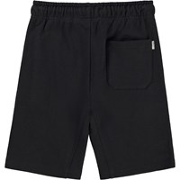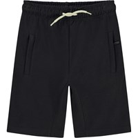 Aliases sind schwarze Shorts aus Öko-Baumwolle. Auf der Vorderseite befinden sich Taschen mit verdecktem Reißverschluss und auf der Rückseite eine einzelne Gesäßtasche. Aliases hat ein weißes Bindeband in der Taille.