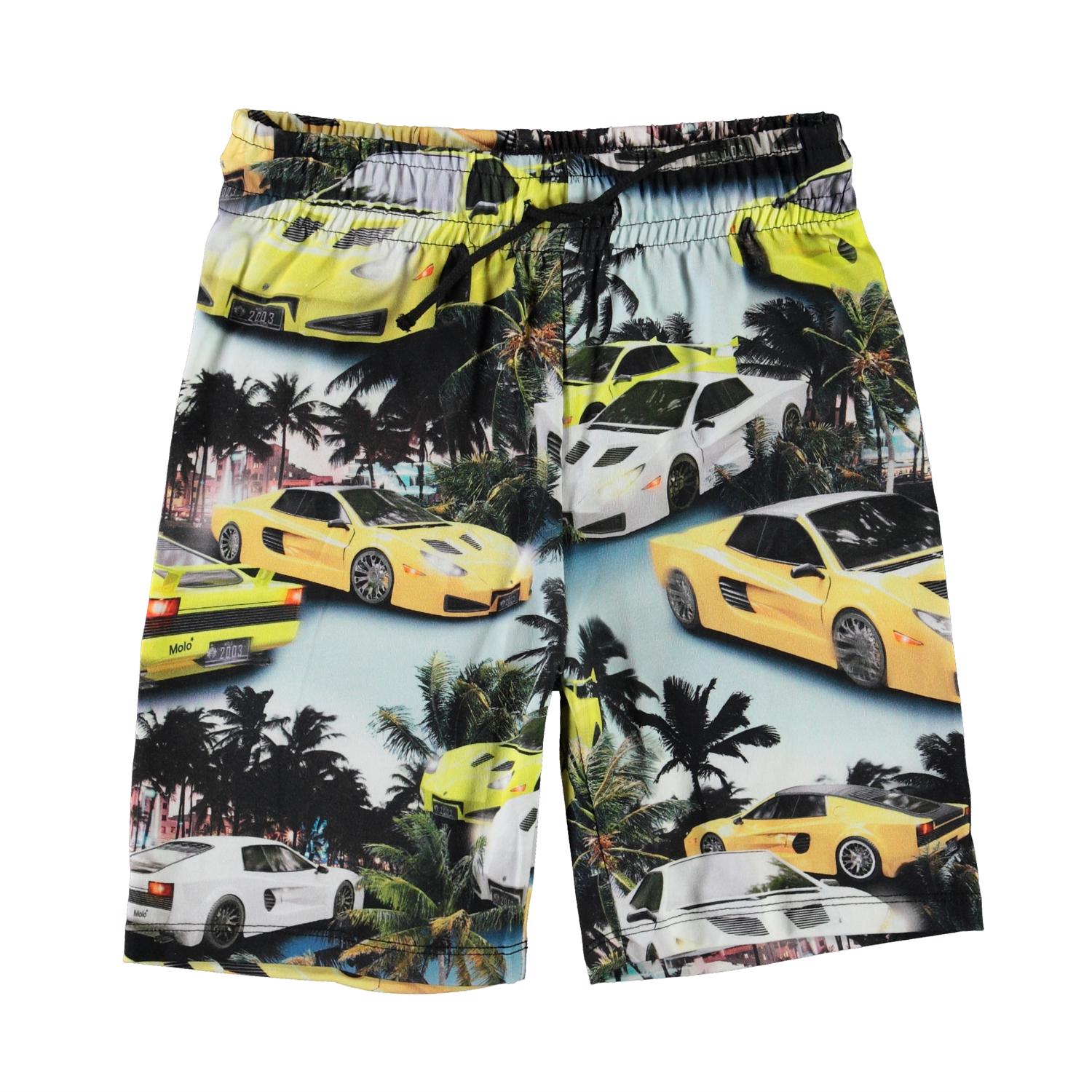 Alim sind ein Paar weiche und bequeme Shorts mit Druck von schnellen Autos und Palmen auf einem hellblauen Hintergrund. Die Shorts haben eine elastische Taille mit Bindeband. Ecocert Greenlife, certifikationsnr. 197496.