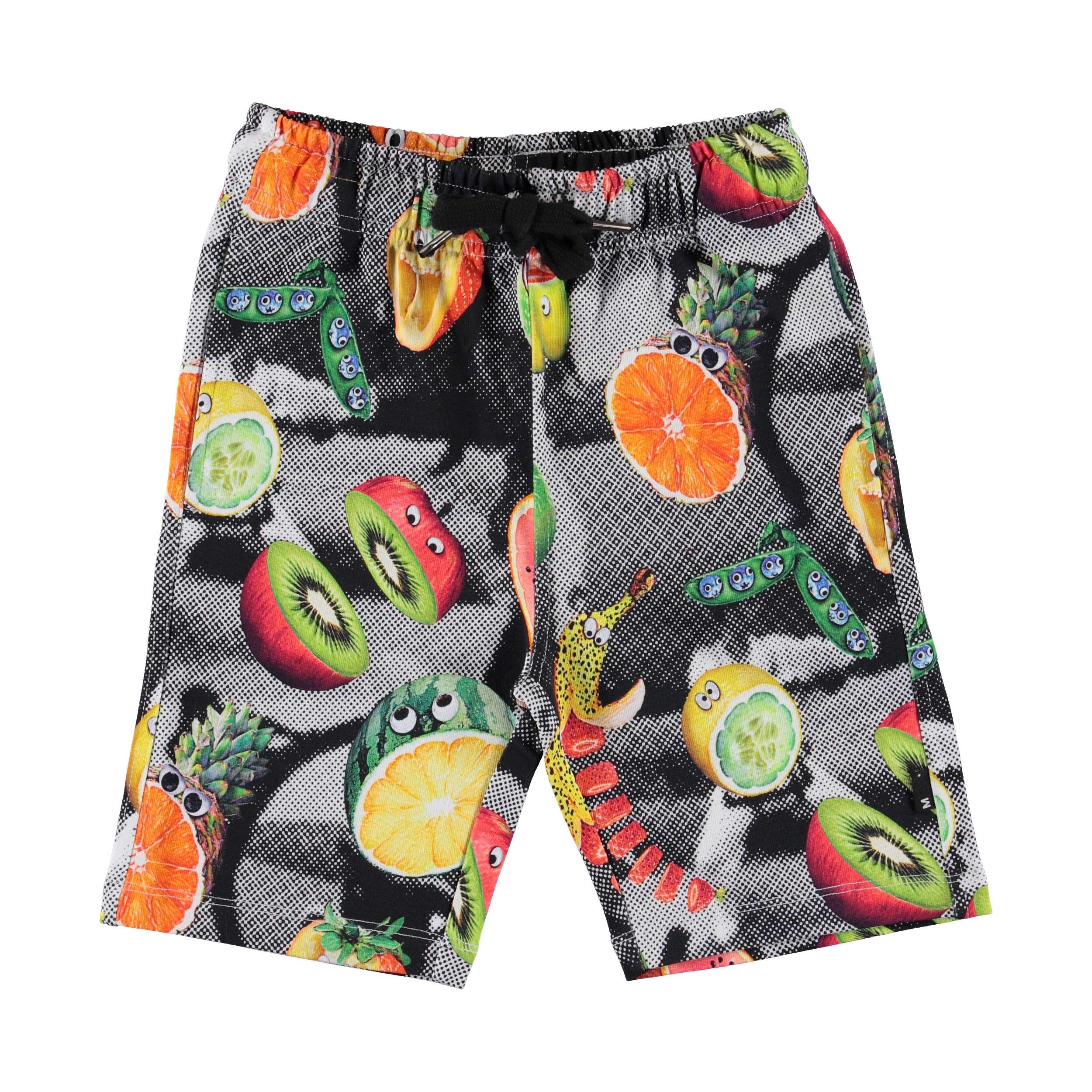 Man weiss nicht immer, was sich hinter der Schale versteckt. Schaue diese köstlichen Früchte auf Molos Print 'Karate Fruit' hier auf den Allwin Shorts an. Allwin hat eine elastische Taille mit Kordenzug.