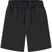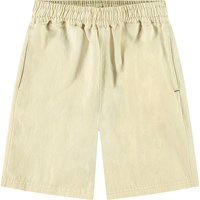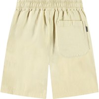 Beige Shorts aus Leinen. Die Shorts haben einen elastischen Bund mit innenliegenden Zugbändern, eine einzelne Gesäßtasche und eine reguläre Passform.