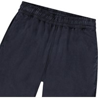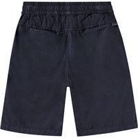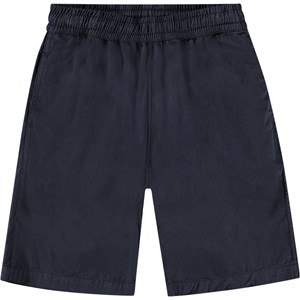 Dunkelblaue Shorts aus Öko-Baumwolle. Die Shorts haben einen breiten elastischen Bund mit einem internen Kordelzug, Taschen an den Seiten und hinten sowie eine reguläre Passform.
