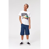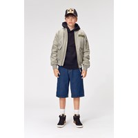 Art ist eine knielange dunkelblaue verwaschene Denim-Shorts. Die Shorts hat Taschen vorne und hinten und hat einen schwarzen Lederpatch mit Logo auf der Rückseite. Dieses Molo-Produkt besteht aus zertifizierter Öko-Baumwolle.