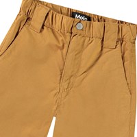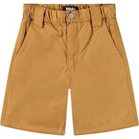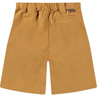 Braune Chino-Shorts aus Öko-Baumwolle. Diese Shorts verfügen über einen elastischen Bund, einen Knopfverschluss, drei Taschen, breite Gürtelschlaufen und eine reguläre Passform.