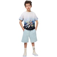 Hellblaue knielange Jeansshorts aus weicher, ökologischer Baumwolle. Die Shorts haben einen elastischen Bund, Seitentaschen, eine Gesäßtasche und eine entspannte, lockere Passform.