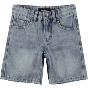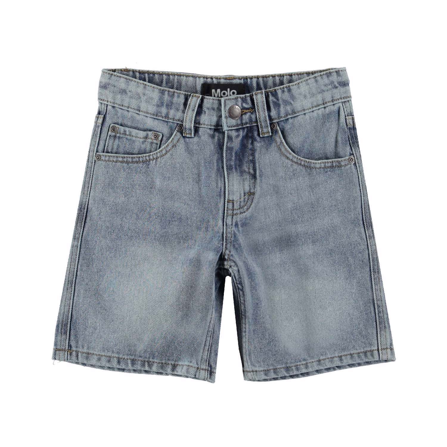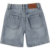 Avian ist eine helle verwaschene Jeansshorts. Die Shorts hat Taschen vorne und hinten und hat einen braunen Lederpatch mit Logo auf der Rückseite. Dieses Molo-Produkt besteht aus zertifizierter Öko-Baumwolle.