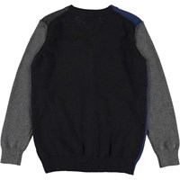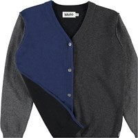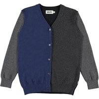 Basel ist eine color-blocking Strickjacke mit den Farben Grau und Blau in verschiedenen Nuancen. Basel hat V-Halsausschnitt und Knopfverschluss