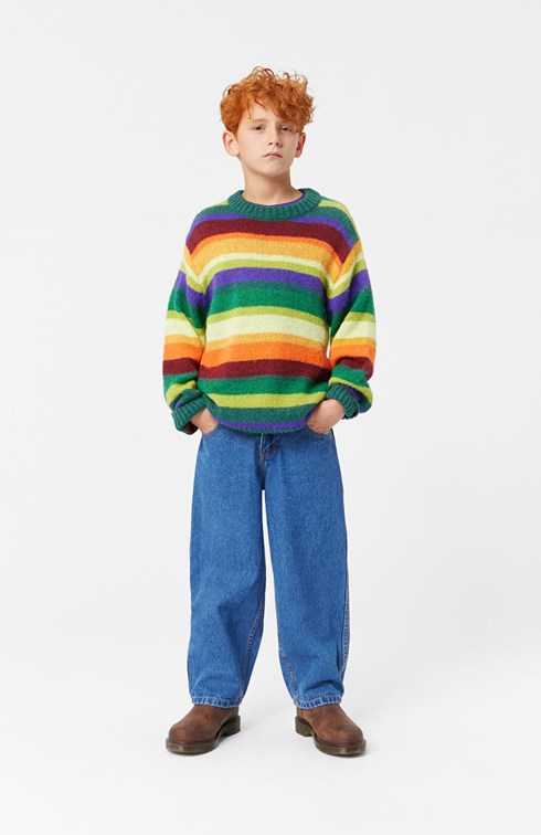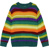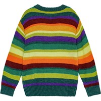 Bunt gestreifter Pullover aus Alpaka und Acryl gestrickt. Ein klassisches Design mit Rundhalsausschnitt, gerippten Kanten und lockerer Passform.