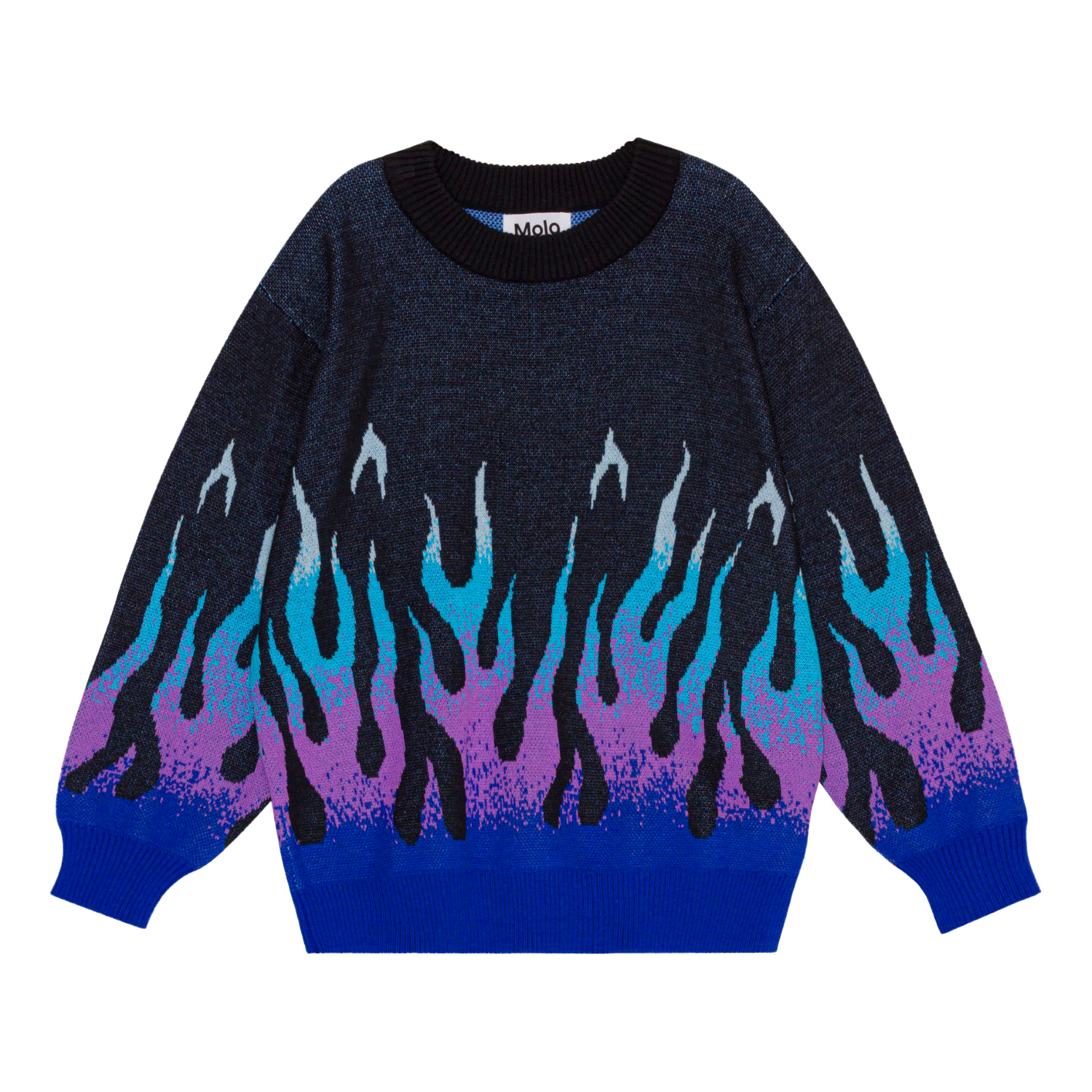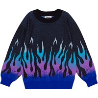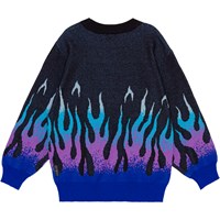 Dunkelgrauer Öko-Strickpullover mit grafischem Flammenmotiv. Die Flammen befinden sich unten an den Ärmeln und am Körper und haben eine abgestufte Farbskala von Blau über Lila bis Türkis, was den Eindruck erweckt, dass die Flammen über das Hemd lecken. Der Pullover hat eine lockere Passform, einen Rundhalsausschnitt mit Rippbündchen und Rippbündchen an Handgelenken und Hüften.