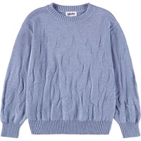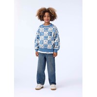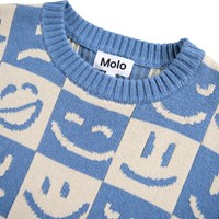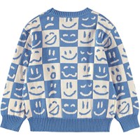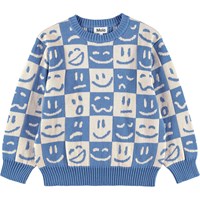 Gestrickter Pullover aus einer Baumwoll- und Wollmischung mit kariertem Muster in Blau und Weiß mit lächelnden Gesichtern. Der Pullover hat einen Rundhalsausschnitt mit gerippten Kanten, lange Ärmel sowie gerippte Abschlüsse an Ärmeln und Saum.