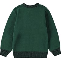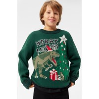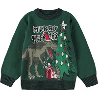 Grüner gestrickter Pullover aus Baumwolle/Acryl mit einem Rundhalsausschnitt, gerippten Bündchen und Saum. Der Pullover hat eine lockere Passform und auf der Vorderseite ist ein Muster von einem wunderschönen Weihnachtsbaum und einem Dinosaurier-Elf, der sehr aufgeregt ist, was er zu Weihnachten bekommen wird.