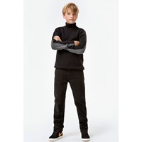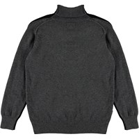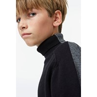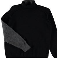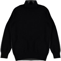 Birger ist eine gestrickte Rollkragenbluse mit schwarzer Vorderseite und grauer Rückseite. Die Strickbluse hat eine leichte Oversize-Passform.