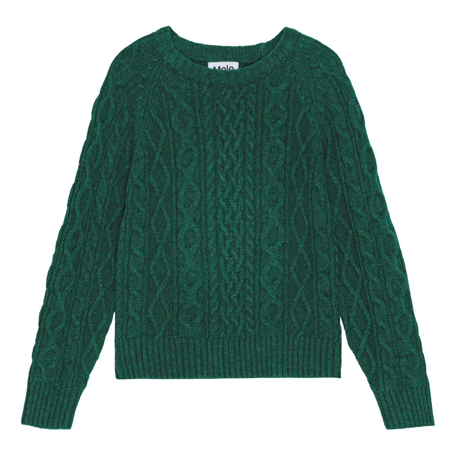 Grüner Pullover aus weichem Zopfmusterstrick, hergestellt aus einer Mischung aus Wolle und Acryl. Der Pullover hat lange Ärmel, einen Rundhalsausschnitt und gerippte Abschlüsse.