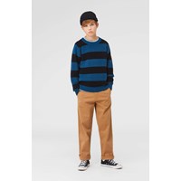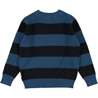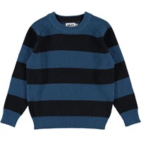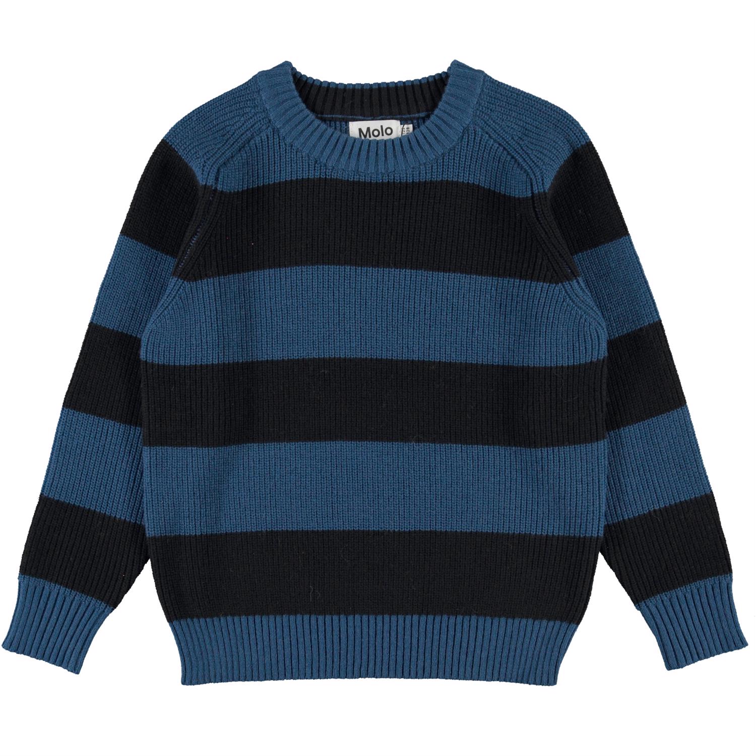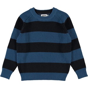 Bosse ist ein schwarz-blau gestreifter Baumwollstrickpullover. Dieses Molo-Produkt besteht aus Öko-Baumwolle.