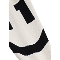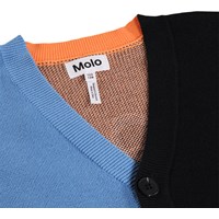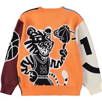 Mehrfarbige Strickjacke aus Öko-Baumwolle mit V-Ausschnitt, gerippten Kanten am Hals, an den Ärmeln und am Saum sowie Knöpfen vorne. Die Strickjacke ist mit bunten Figuren und Elementen verziert, die von der Welt des Basketballs inspiriert sind, um ihr einen verspielten und sportlichen Ausdruck zu verleihen.
