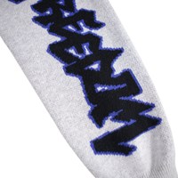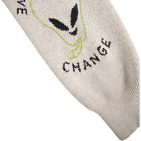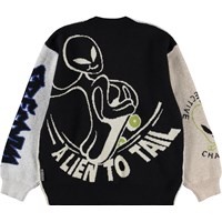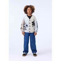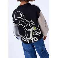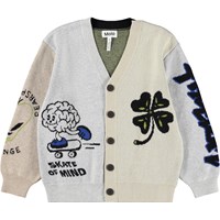 Bunt gestrickte Strickjacke aus Baumwolle/Wolle mit V-Ausschnitt, Knöpfen, gerippter Leiste und gerippten Kanten an den Ärmeln und am Saum. Die Strickjacke hat eine reguläre Passform und ein Muster aus verschiedenen Grafiken sowie einem großen Alien auf der Rückseite.