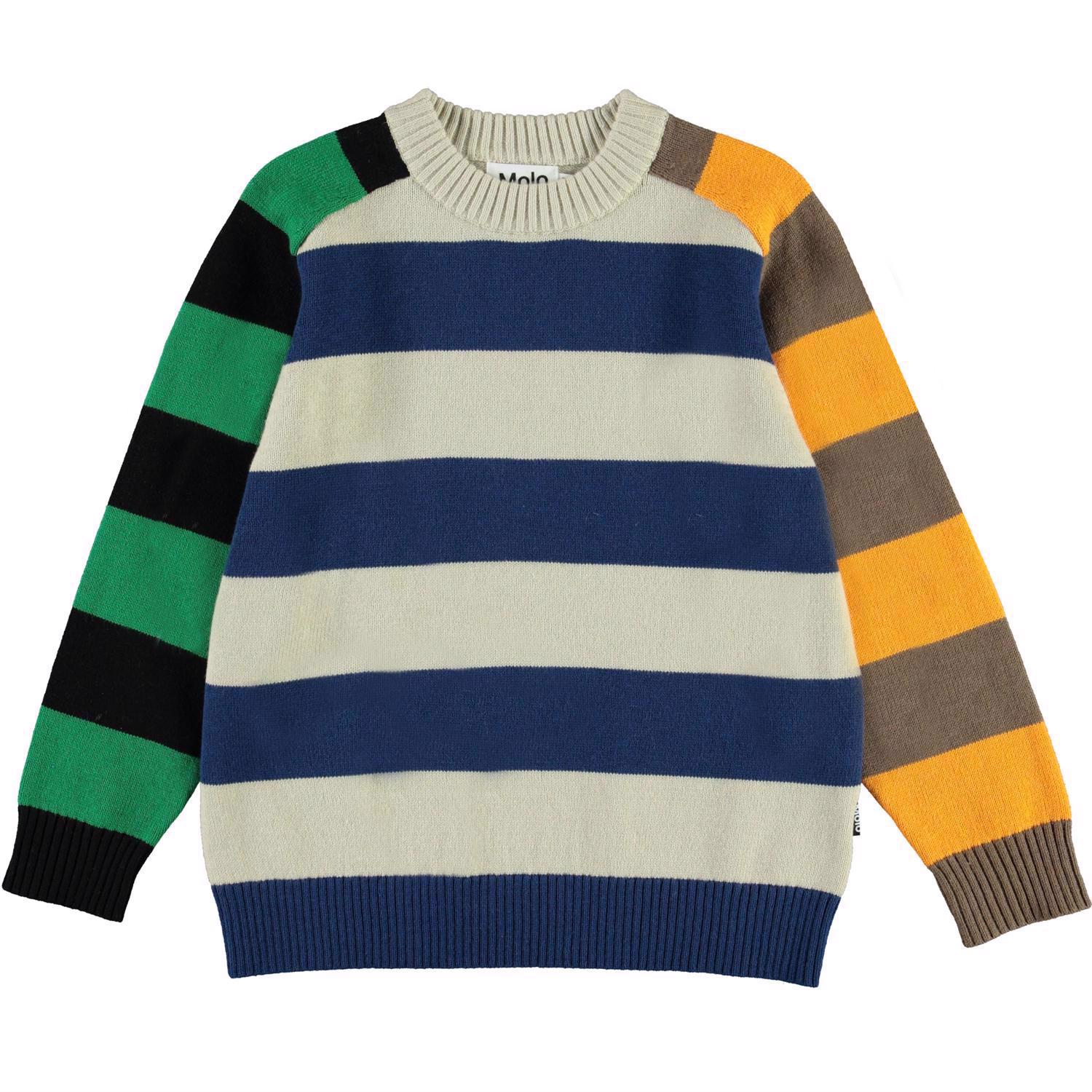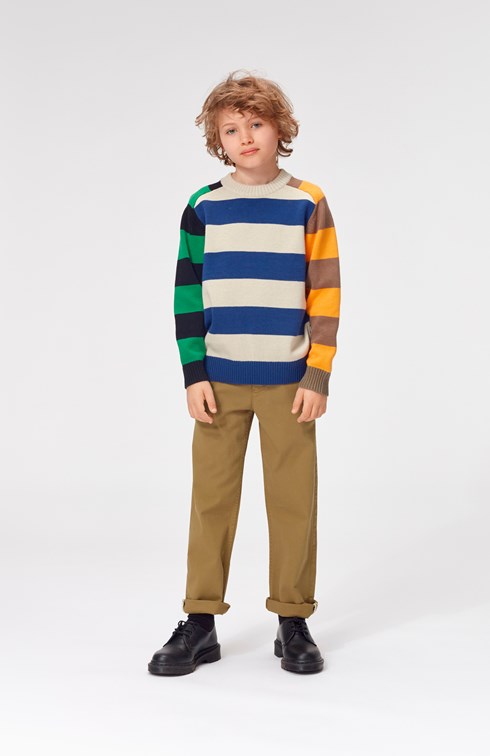 Buzzy ist ein Strickpullover aus Baumwollmix mit breiten, bunten Streifen. Buzzy hat Rippstrick am Hals, Handgelenk und Hüfte.