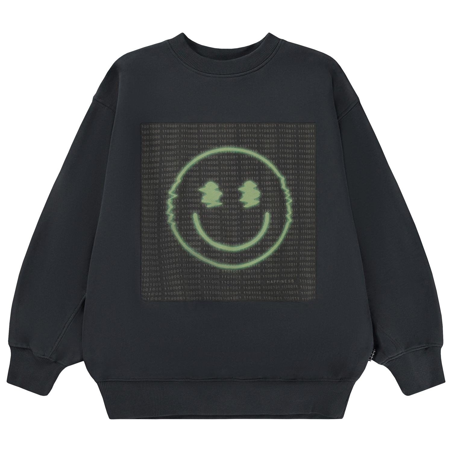 Schwarzes Sweatshirt mit grünem Computer Glitch Frontprint. Der Druck zeigt ein großes lächelndes Gesicht mit einem Fehler am Rand vor einem Hintergrund aus Computercodes. Dieses Sweatshirt besteht aus 100% Baumwolle, hat einen Rundhalsausschnitt mit Rippbündchen, Rippbündchen an Hüfte und Ärmeln und eine normale Passform.