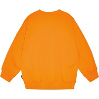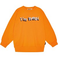 Oranges Sweatshirt aus Öko-Baumwolle mit gebürstetem Innenfutter, das weich und warm zu tragen ist. Das Sweatshirt hat eine lockere Passform, lange Ärmel mit tiefen Schulternähten, einen Rundhalsausschnitt, gerippte Kanten und einen Frontdruck eines Textes aus Pixeln, der "Ich bin echt" sagt.