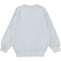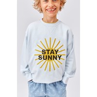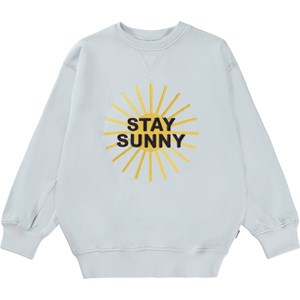 Magni ist ein hellblaues Sweatshirt mit aufgestickter Sonne und dem Text „Stay Sunny“. Das Sweatshirt hat Rippkante am Hals, am Saum und an den Ärmelenden.